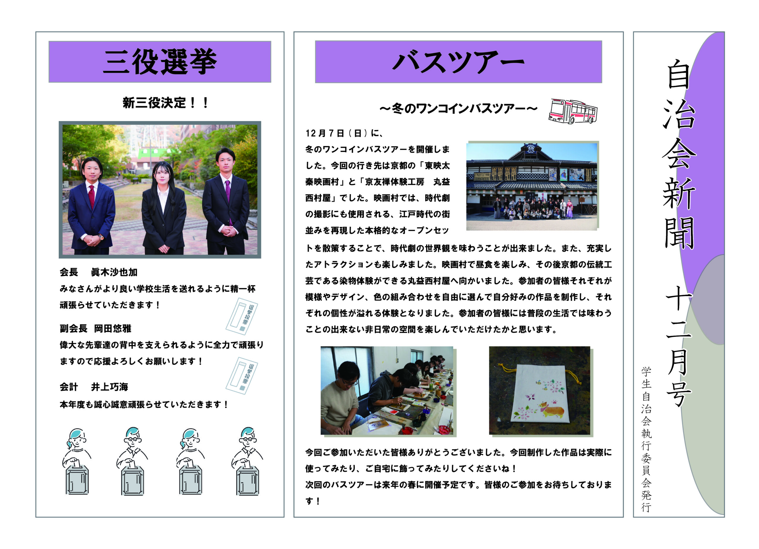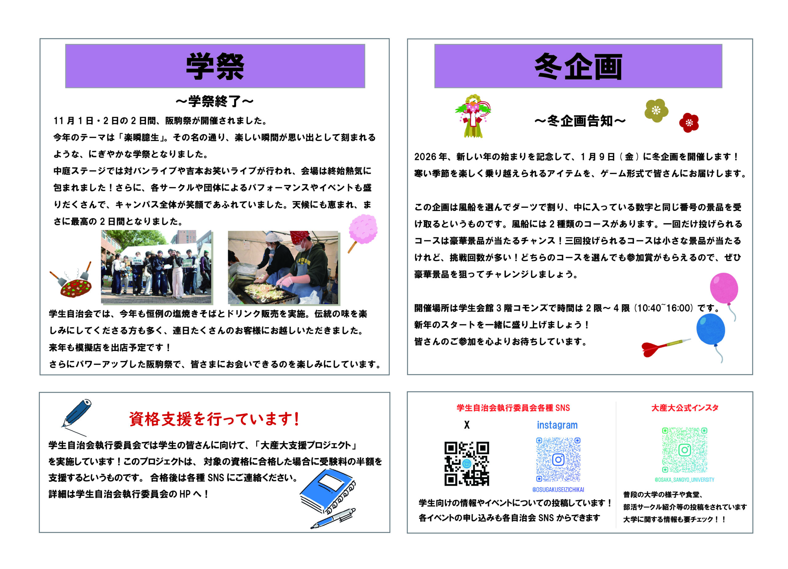 今月号は、先日行われた三役選挙に加え、学祭や冬のワンコインバスツアー、さらに来月開催予定の冬企画「新春ダーツ」についての告知記事など、掲載内容が盛りだくさんです!